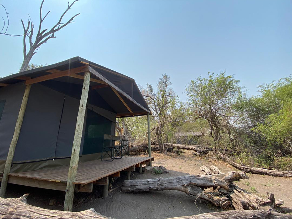 Ethan’s Camp is set along the Mbudi River, near Moremi Game Reserve. It offers tented accommodation with 6 en suite rooms: 2 luxury suites (perfect for honeymooners), 1 double room and 3 twin-bedded rooms. All rooms face the river, providing picturesque views.